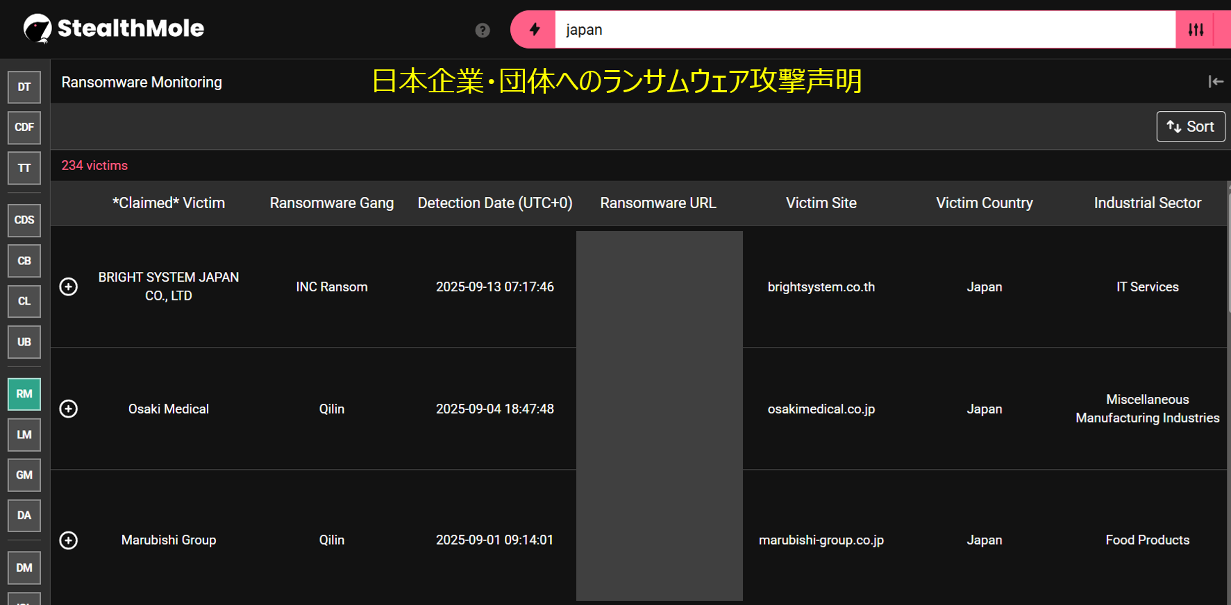 2025年9月は以下の日本企業3社に対するランサムウェア攻撃表明がありました。