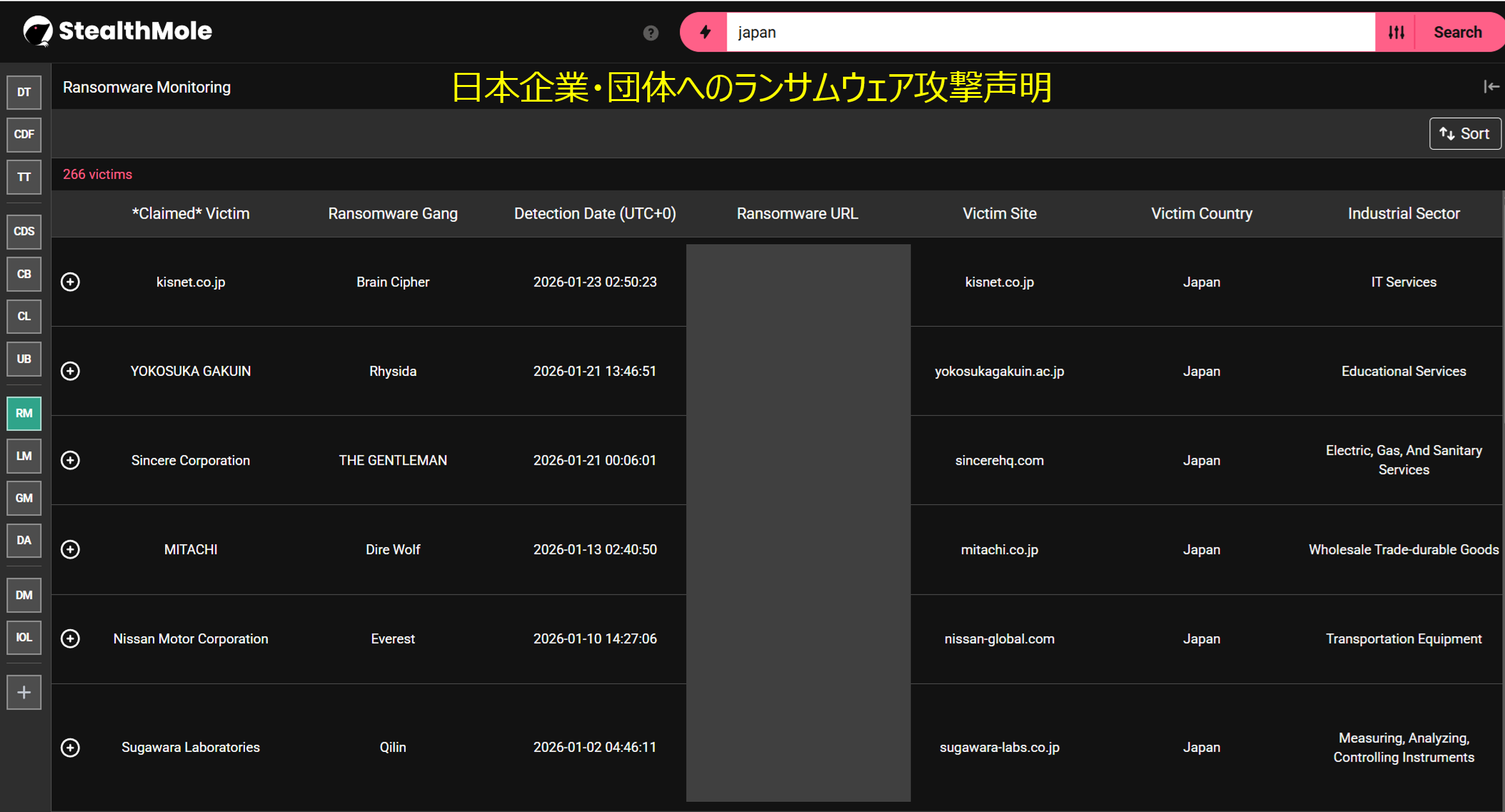 2026年1月は以下の日本企業6社に対するランサムウェア攻撃表明がありました。