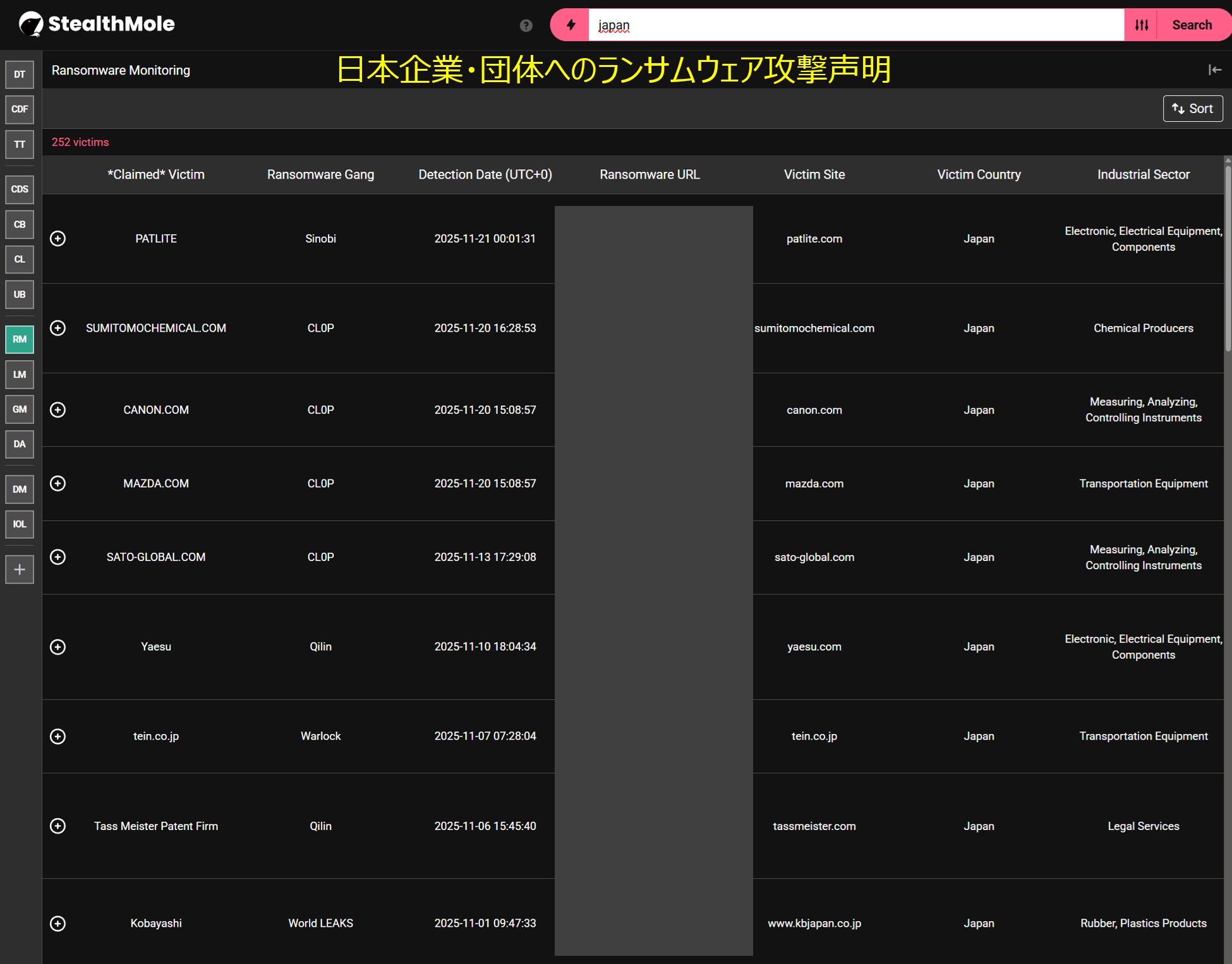 2025年11月は以下の日本企業9社に対するランサムウェア攻撃表明がありました。