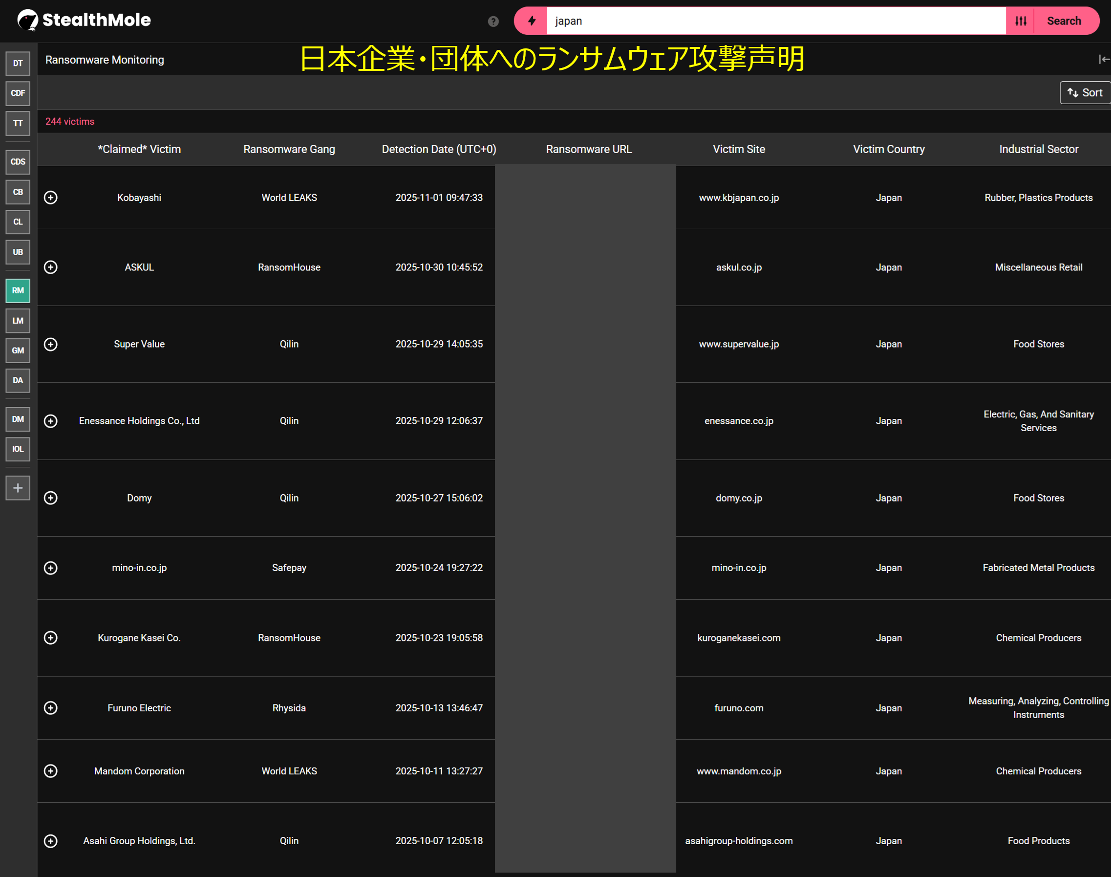 2025年10月は以下の日本企業10社に対するランサムウェア攻撃表明がありました。