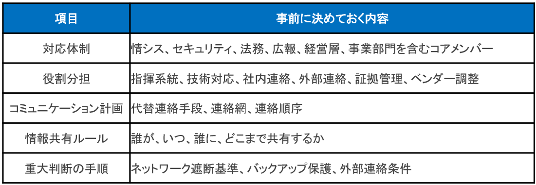 ランサムウェア復旧を成功させるための出発点は、ツールや予算より先に、インシデント対応計画を実務の中で使える形にしておくことです。以下の表に主な作成項目を整理しました。