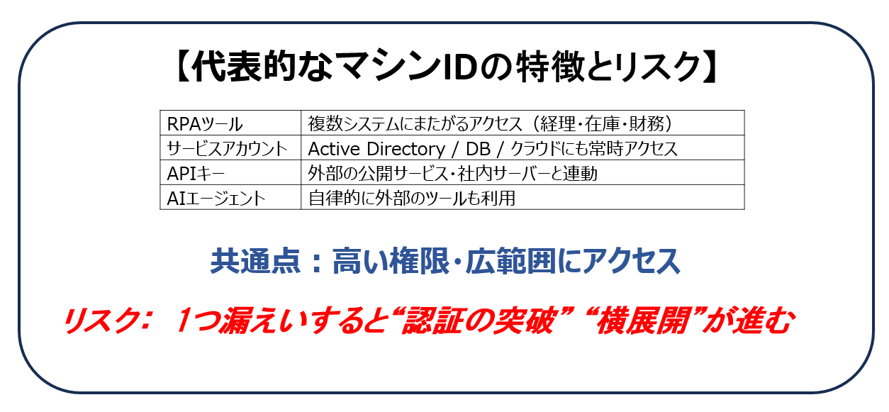 企業で日々稼働しているマシンIDには、どのようなリスクがあるのでしょうか?
