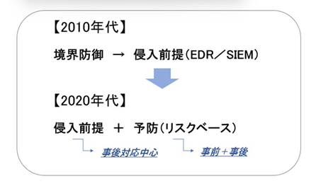 現在はその次のフェーズ、事後対応と事前対応の併用、つまり侵入前提のシステムに加えてサイバー攻撃を予防する体制を強化し、先鋭化する攻撃に対峙する動きが出てきたというわけです。