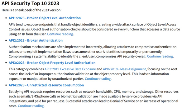 「OWASP:API Security Top 10 2023」。アクセス権限の管理不足、認証の不具合などの項目が上位にランク