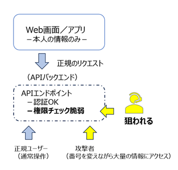 APIを狙う攻撃で特に被害が多いのは、認証・許可の不備を突くものです。例えば、会員番号や社員番号をリクエストすると、その番号にひも付く個人情報や業務の記録をレスポンスするシステムが稼働しているとします。API側の設定に不備があると、番号を変えたリクエストに対しても、許可されていない情報を開示してしまうケースがあります。
