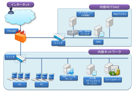 (*)DMZ(Demilitarized Zone):外部からの攻撃を受けやすいシステムを置き、攻撃の内部への広がりを防ぐためのエリア